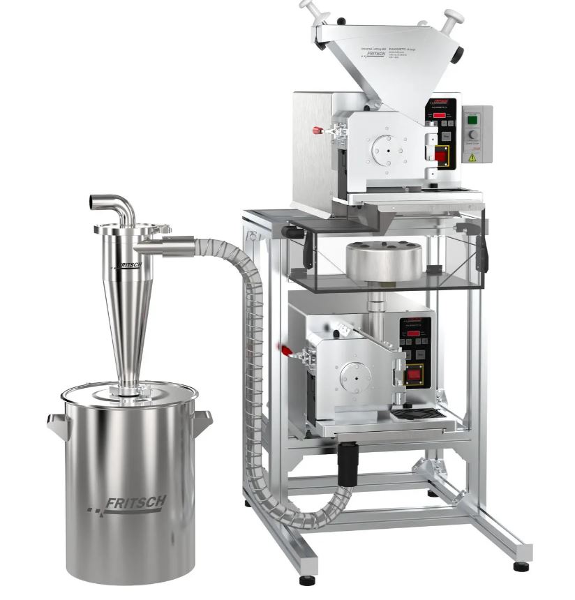 La combinaison des broyeurs à couteaux FRITSCH Pulverisette 19 et Pulverisette 25 a été conçue pour le broyage en deux temps d’échantillons très hétérogènes. Le broyage s’effectue de manière automatique sur deux niveaux. L’aspiration du broyat se fait via la sortie cyclone.
