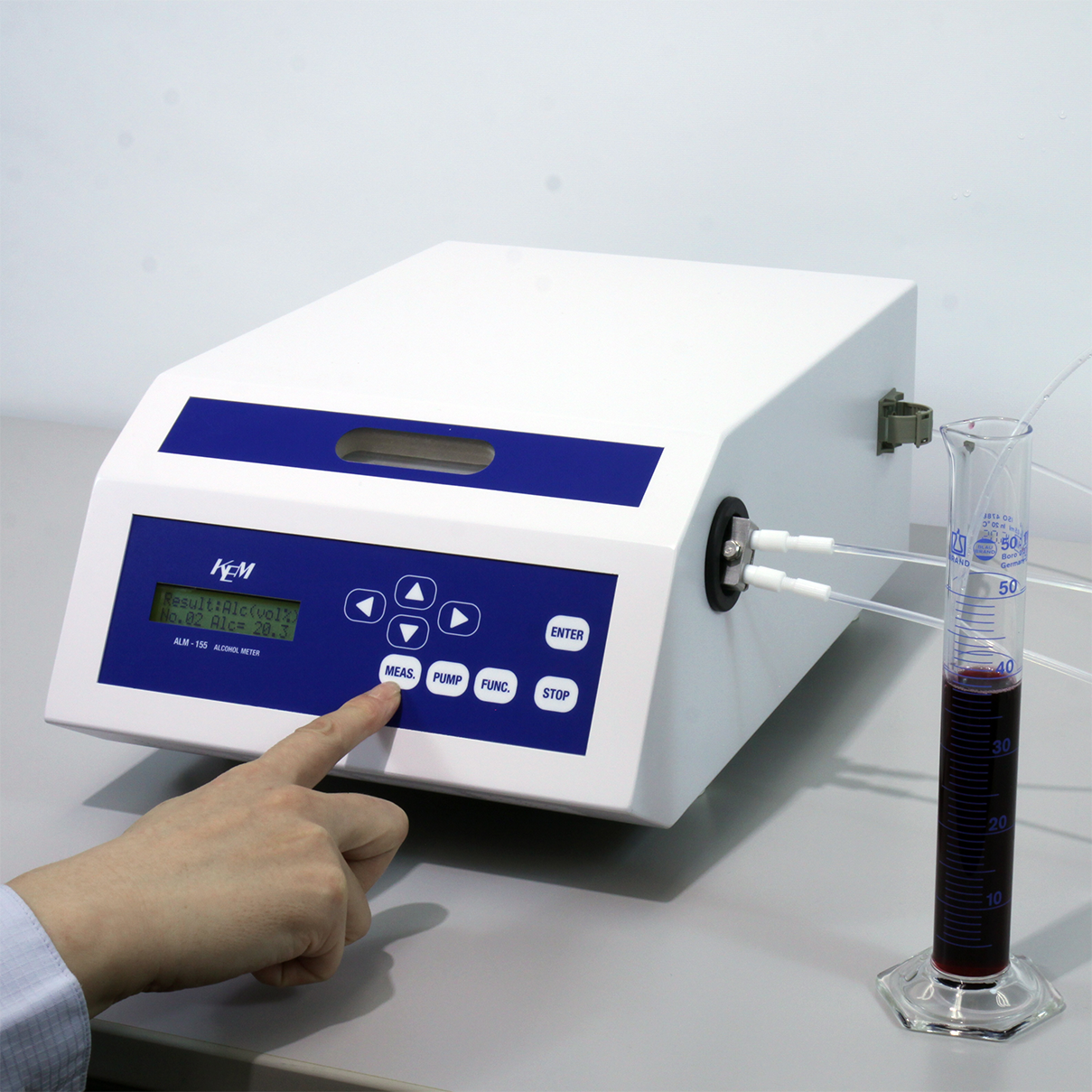 L’ALM-155 affiche les résultats avec une haute résolution de 0,01% pour la teneur en alcool et de 0,00001g/cm3 pour la masse volumique. De plus, grâce au système de thermostat Peltier, la température est fixée à exactement 20°C.